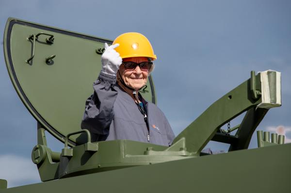 98岁的洛伊丝·雷·吉恩周五在庆尚南道昌原市的韩华航天工厂内,坐进一辆K9自行榴弹炮驾驶舱留影。这位曾在朝鲜战争(1950-1953)期间服役于美军医院船"避风港号"的前海军护士,此次受邀参加韩华集团与韩国退伍军人事务部共同主办的活动,纪念韩美同盟建立72周年。现场共有85名朝鲜战争老兵、驻韩美军人员及家属参与这场温情涌动的大聚会。(韩华航天)