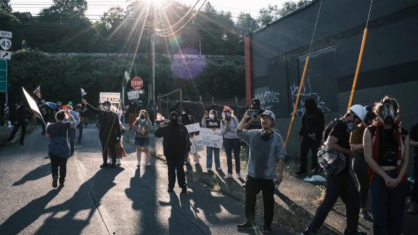 在波特兰西南部威拉米特河畔的移民执法局大楼外,示威者扎营已持续数月,规模罕有超过二十余人。